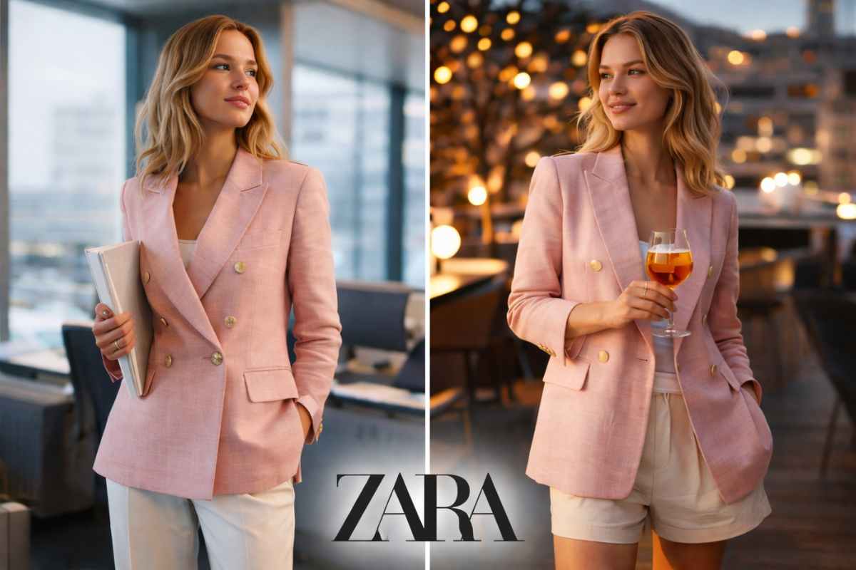 Quest’anno, tra le proposte più interessanti del fast fashion internazionale, uno dei candidati più seri al titolo di blazer must-have della primavera arriva da Zara: un blazer doppiopetto in lino 100% color rosa quarzo, elegante quanto basta e sorprendentemente versatile.
